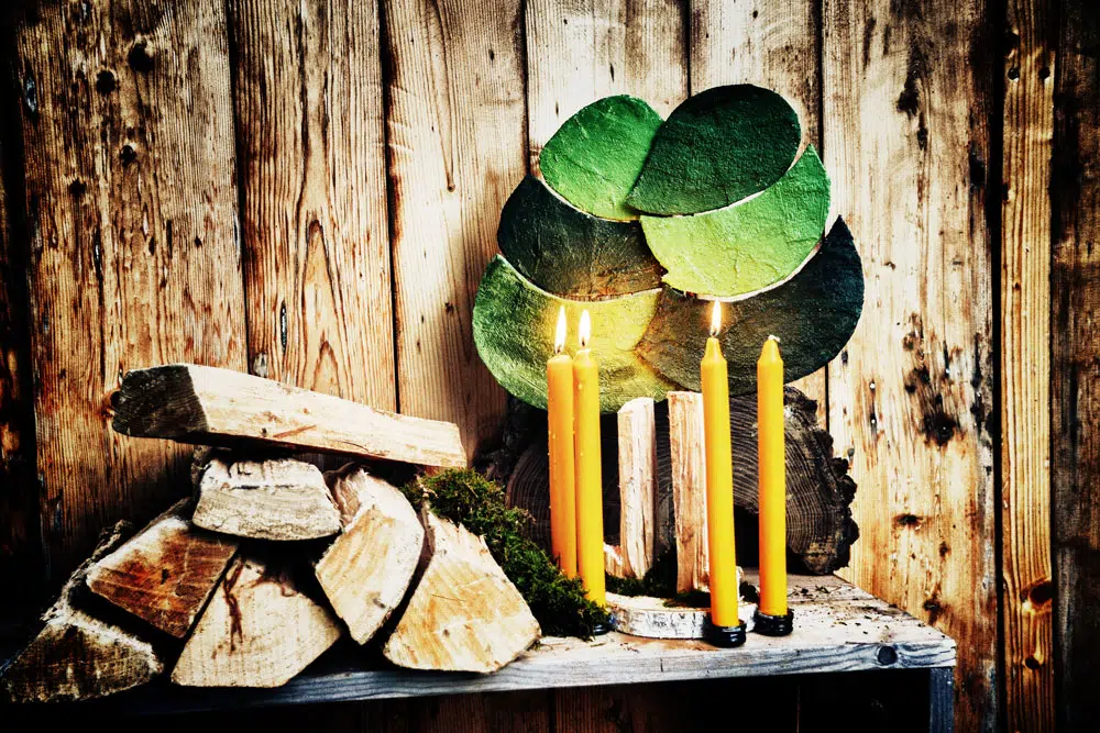 Vor-Weihnachtsdeko mal anders: man nehme ein paar Holzreste, alte Pappe, vier Schraubverschlüsse von Saftflaschen – und suche einen passenden Namen. Adventskranz passt nicht mehr ganz. Aber die Bienenwachskerzen riechen ganz heimelig, das weckt Kindheitserinnerungen während der Arbeitszeit.