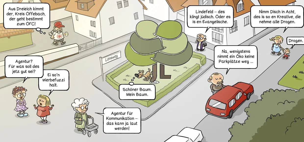 „Gut für uns“ dachten sich alle bei Lindenfeld, der neuen Agentur in Schwanheim – Geschäfte macht ein Schwanheimer Unternehmer am liebsten mit seinesgleichen. Dass ein „Schwanheimer Unternehmer“ nur ist, wer seinen Familienbetrieb in mindestens dritter Generation hier am Ort führt, hat uns natürlich niemand verraten … Natürlich ist das immer mit einem Augenzwinkern gemeint. Aber besonders der echte Schwanheimer weiß: Kein Spaß ohne einen wahren Kern.